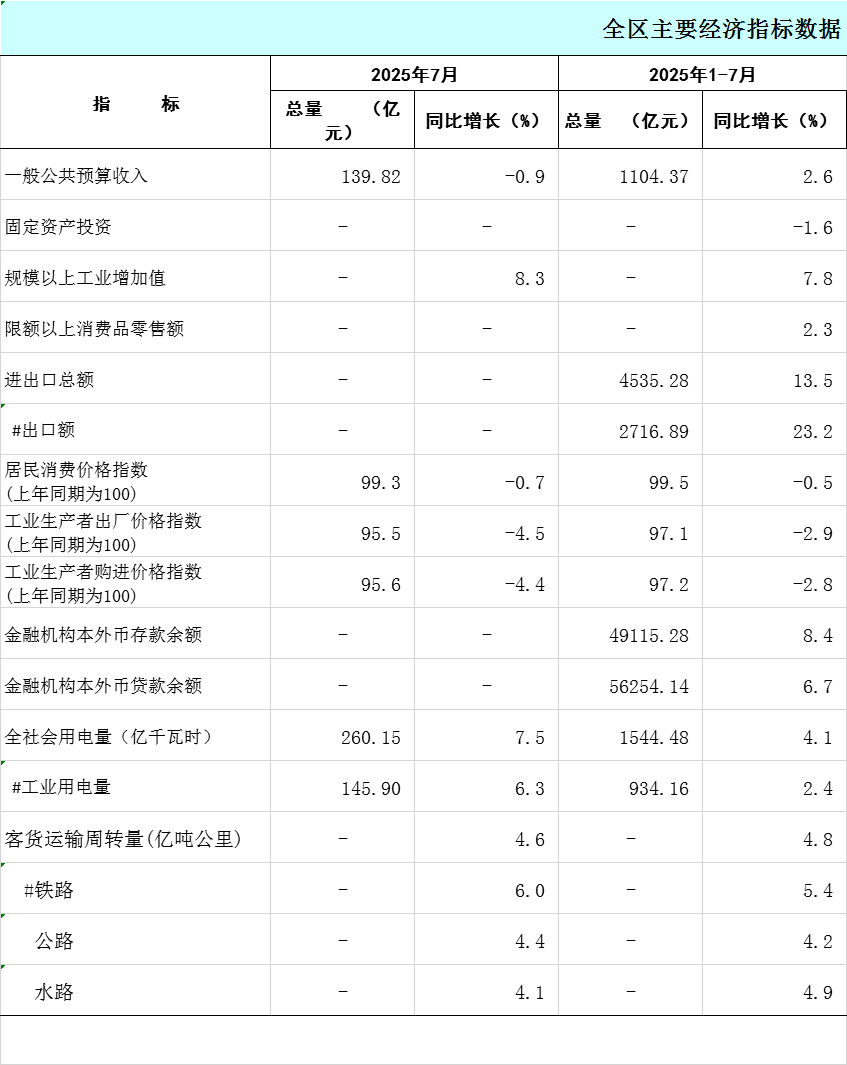 2025年1-7月广西主要经济指标数据
