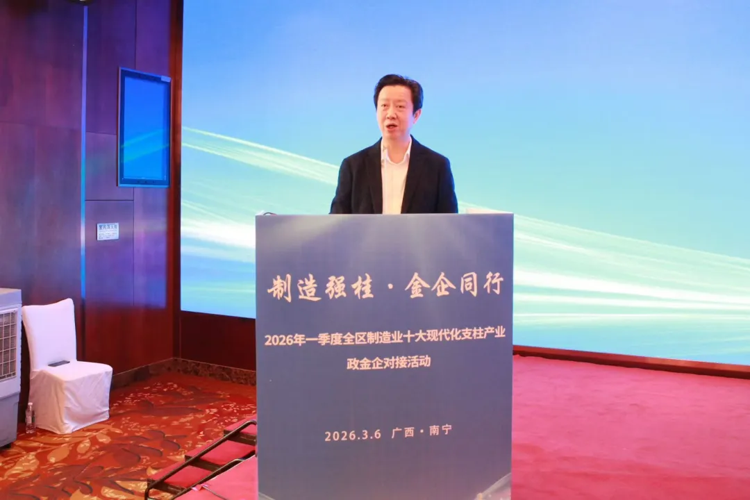 3月6日,2026年一季度全区制造业十大现代化支柱产业政金企对接活动在南宁市成功举办。自治区工业和信息化厅党组书记、厅长袁煌,自治区党委金融办副主任杨瑞华,中国人民银行广西壮族自治区分行党委委员、副行长杨正东出席会议并致辞,自治区工业和信息化厅副厅长柯梅,有关省级金融机构、区直国企分管同志出席会议,自治区相关单位、各设区市工信部门、金融机构及重点企业代表约170人参加。