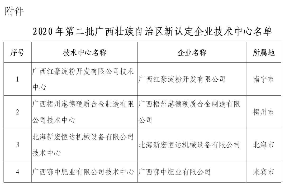 附件:2020年第二批广西壮族自治区新认定企业技术中心名单