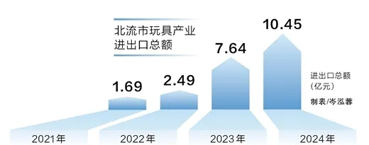 数据显示,北流玩具进出口总额从2021年1.69亿元增至2024年10.45亿元,占玉林市玩具进出口总额比重从79%提升至82%。