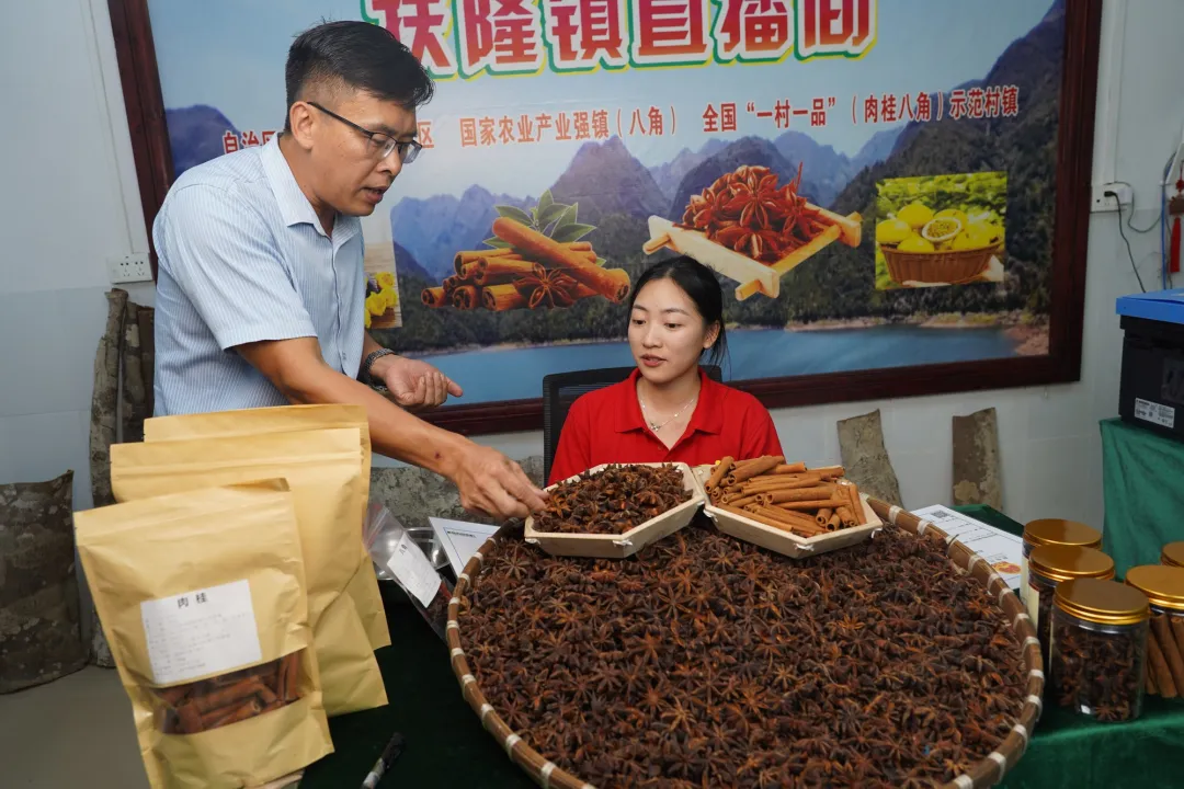 “三、二、一上链接!”“世界的八角看中国,中国的八角看广西,那广西的八角就看防城。你看我们防城八角果状肉厚,颗粒整齐完整,棕红色并有光泽,朵大饱满……家人们赶紧点击下方小黄车购买!”在防城区扶隆镇电商直播基地,主播唐梦琼对着镜头卖力地推介防城的香料产品。作为一名刚毕业的市场营销专业大学生,唐梦琼选择返乡投身直播助农事业。她表示:“山上的八角树比较高,老乡们去采摘很辛苦。如果辛苦采摘没有销路那太可惜了。我选择回家乡做直播这份工作,通过网络把老乡们的八角销售出去,为助农增收增添一份力,让深山飘起‘致富香’是我最大的愿望!”该电商直播基地负责人宋集斌介绍:“我们是通过‘线下+线上’结合的方式销售肉桂八角,线上主要通过互联网(短视频+直播卖货)来销售,通过短视频直播让全国消费者直观了解来自十万大山的特产——防城肉桂、八角,提供从产地直达餐桌的全流程体验式购买。”