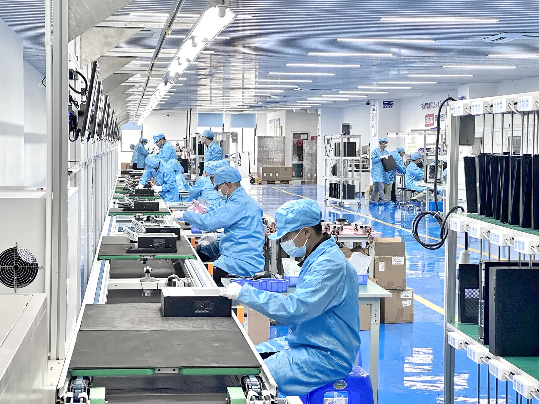 在创鹏云智造(广西)生产基地的生产车间,工作人员组装计算机。