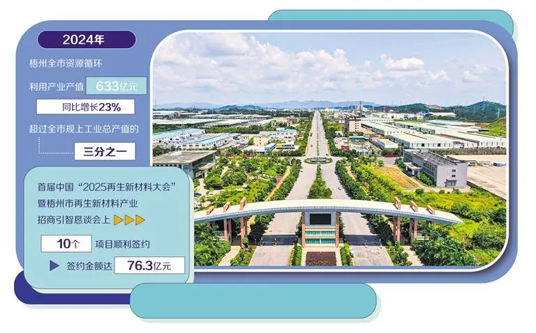 把好区位用出好效果,要让企业看得见发展,更要让聚集效应不断发挥。近年来,梧州聚焦延链、补链、强链,加快推进设备和工艺转型升级,产业布局不断优化,已吸引入驻规模以上再生材料企业49家,其中4家已跨入百亿产值行列。2024年,全市资源循环利用产业产值633亿元,同比增长23%,超过全市规上工业总产值的三分之一。