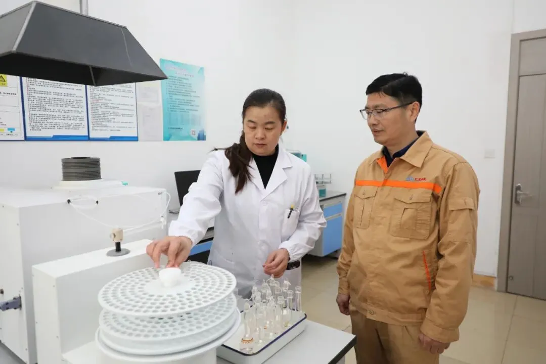 ▲公司副总经理陈奇志(右)现场了解样品分析进度。