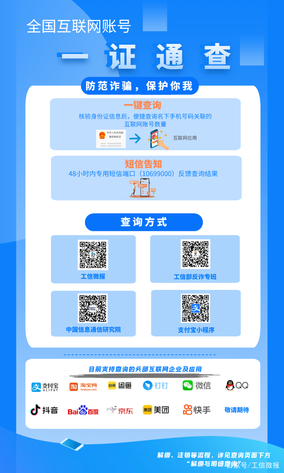 用户可以通过工业和信息化部政务微信号“工信微报”和“工信部反诈专班”、“中国信通院”微信公众号,以及支付宝“一证通查”小程序等方式等进入查询入口。