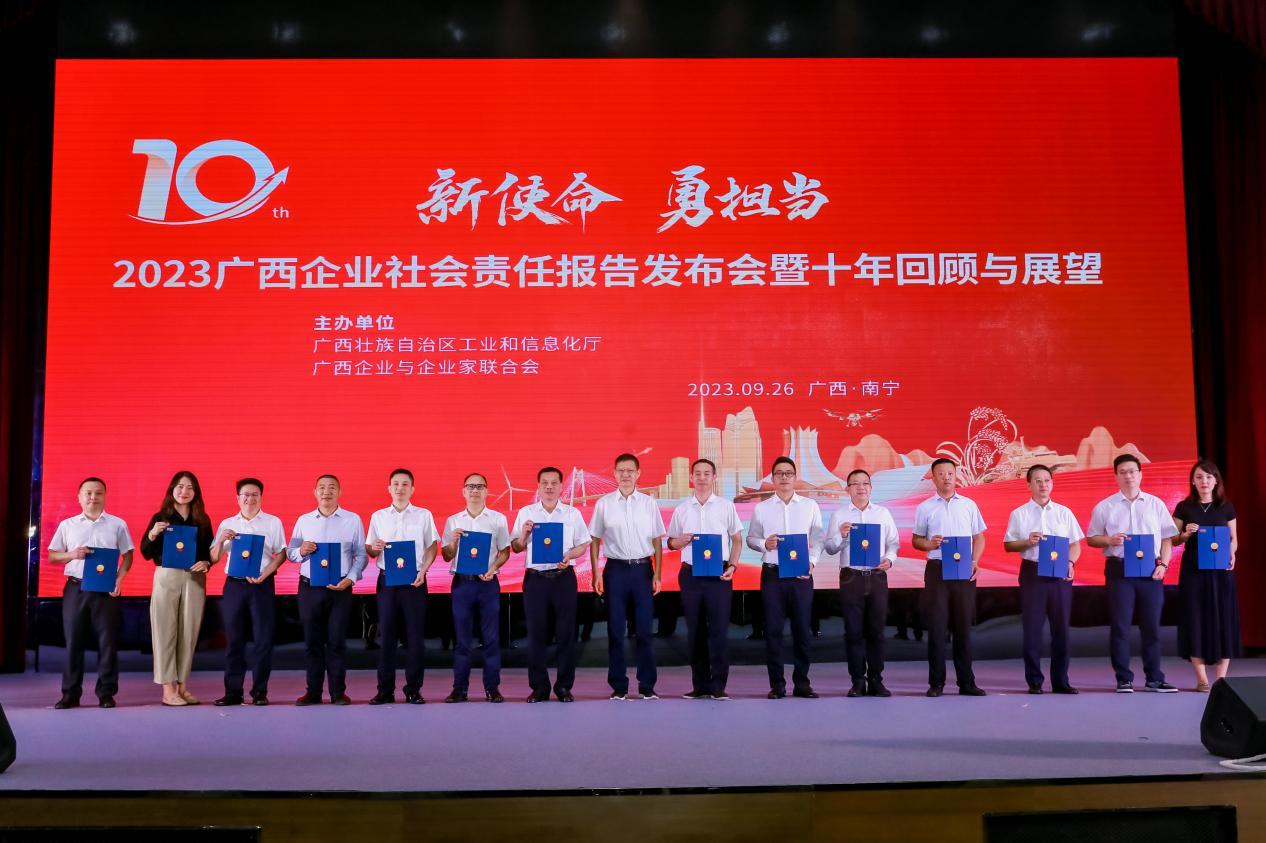 为深入贯彻落实习近平新时代中国特色社会主义思想和党的二十大精神,贯彻落实习近平总书记关于推进企业履行社会责任的重要论述,落实《自治区党委 自治区人民政府关于营造企业家健康成长环境弘扬优秀企业家精神更好发挥企业家作用的实施意见》文件精神,9月26日下午,由自治区工业和信息化厅、广西企业与企业家联合会主办的“2023广西企业社会责任报告发布会暨十年回顾与展望”活动在南宁隆重举行,来自全区不同所有制的100家企业集中发布了企业社会责任报告。自治区有关部门、有关研究机构专家学者、发布企业领导与新闻媒体代表等参加发布会。