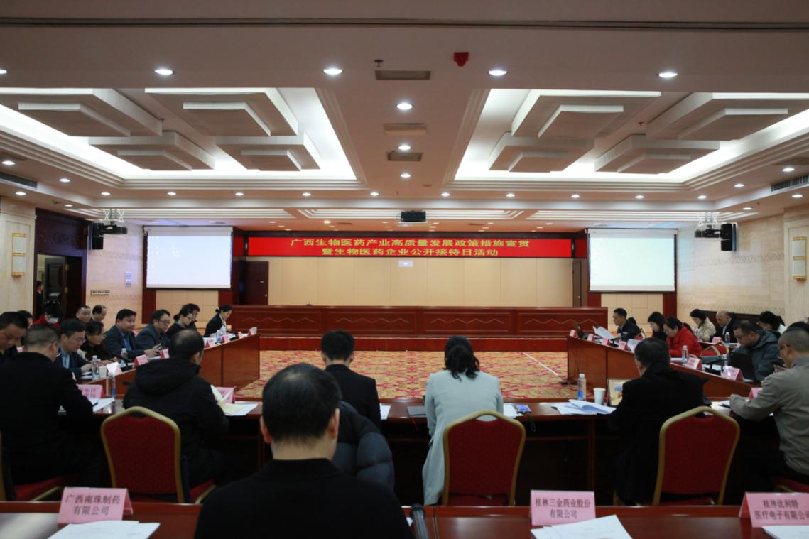 2026年1月5日,自治区工业和信息化厅、科技厅、卫生健康委、医保局、中医药局、药监局等部门在南宁开展广西生物医药产业高质量发展政策措施宣贯暨生物医药企业公开接待日活动。全区30家药械生产企业及各市工信部门约50人参加活动。