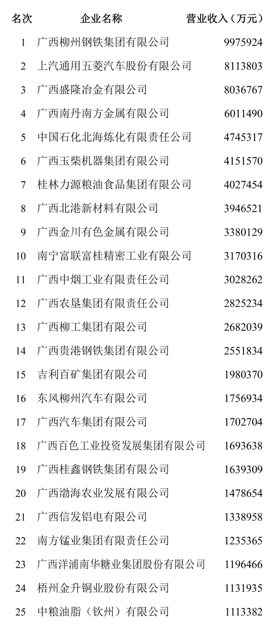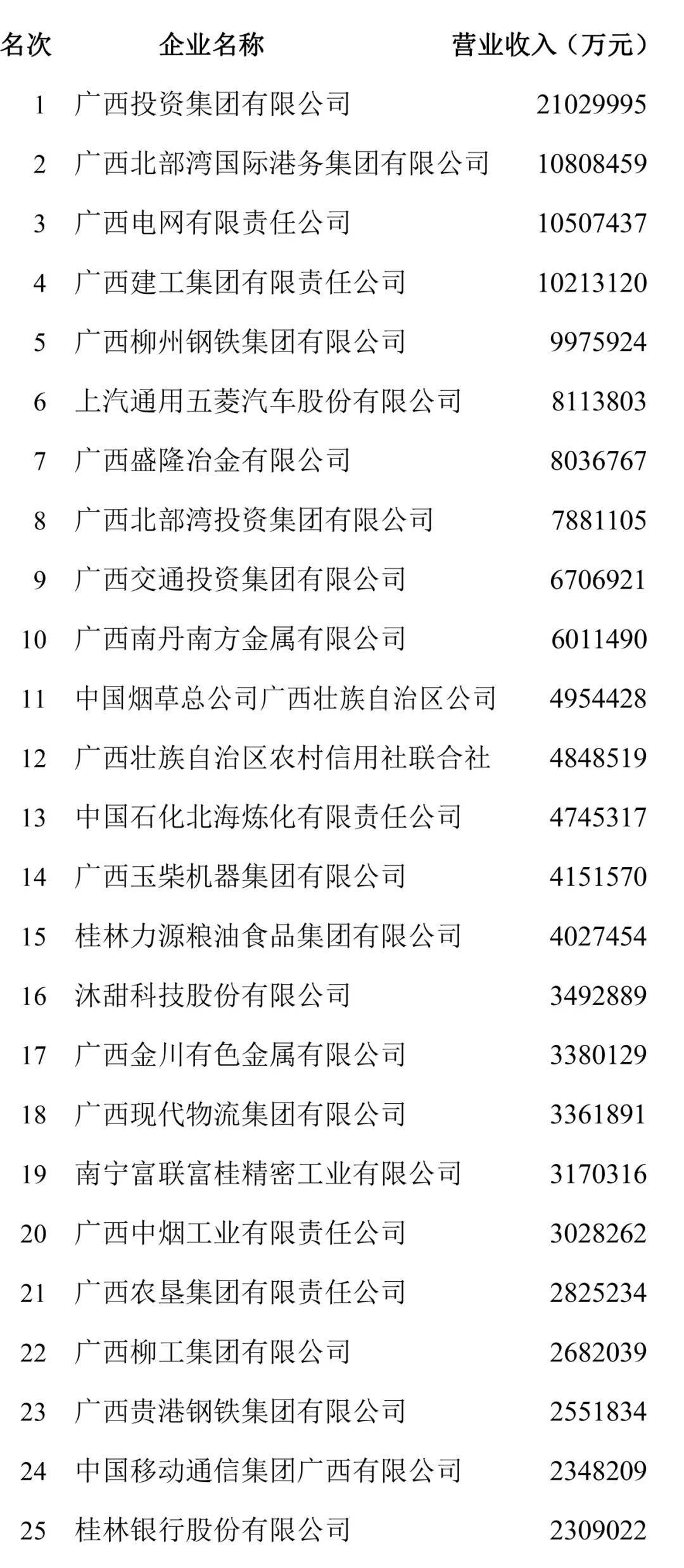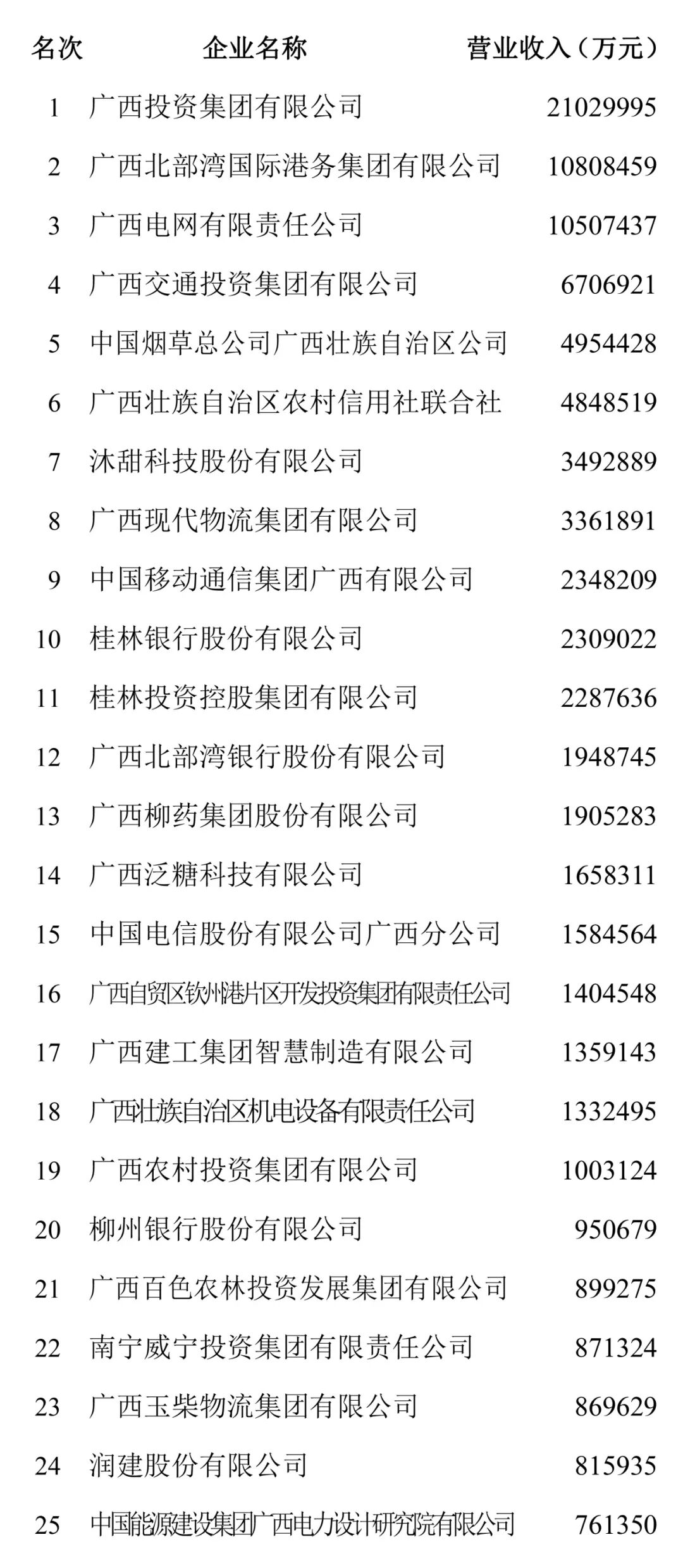 在今年榜单中,广西投资集团有限公司以营业收入2103.00亿元位居榜首,连续七年领跑全区;广西北部湾国际港务集团有限公司、广西电网有限责任公司分别以营业收入1080.85亿元、1050.74亿元占据榜单第二、三位。