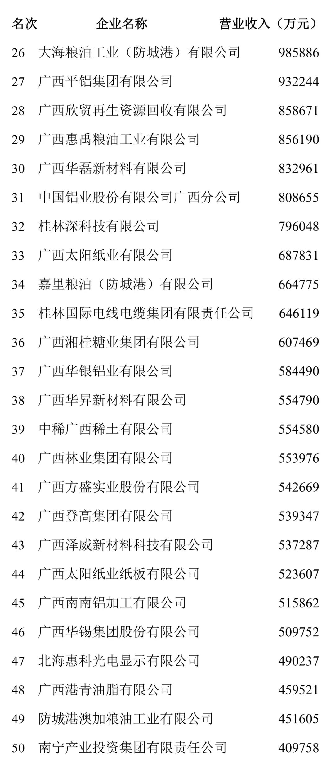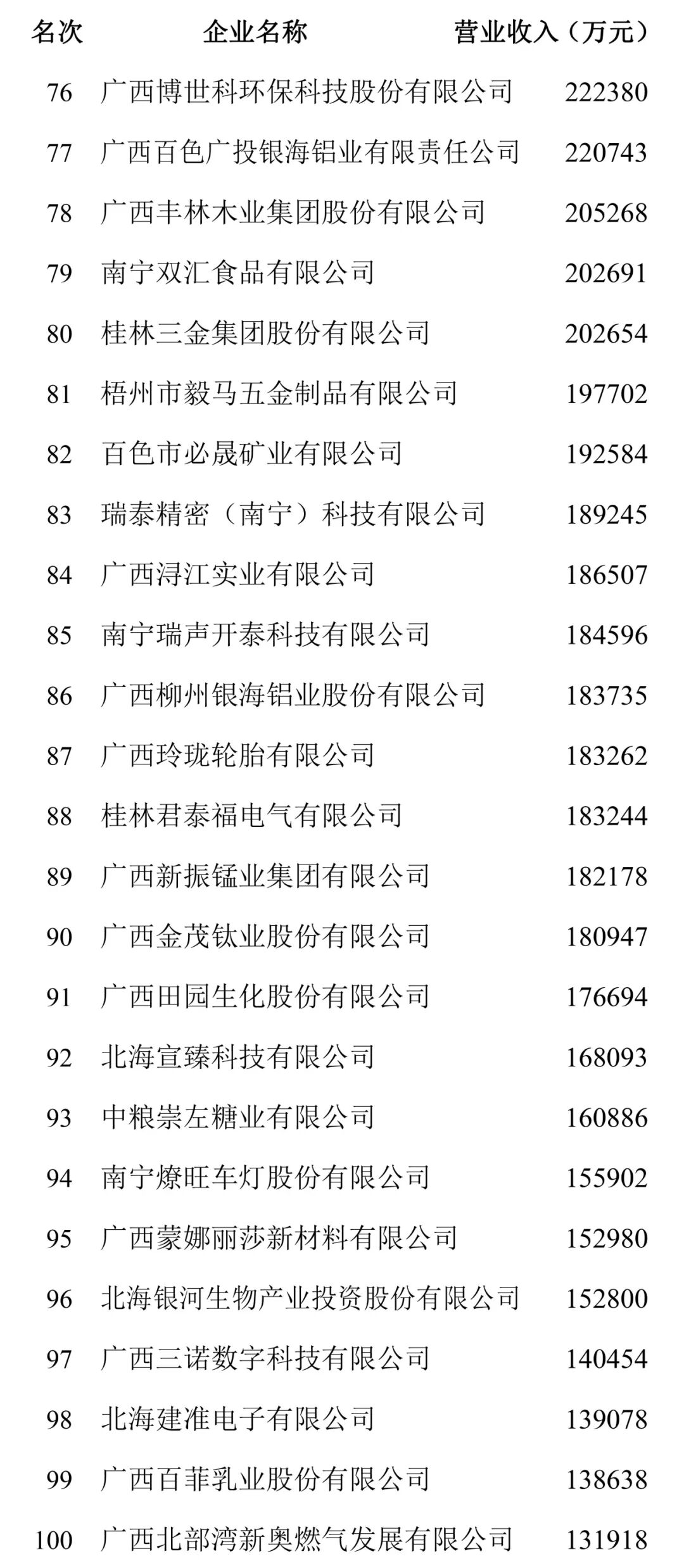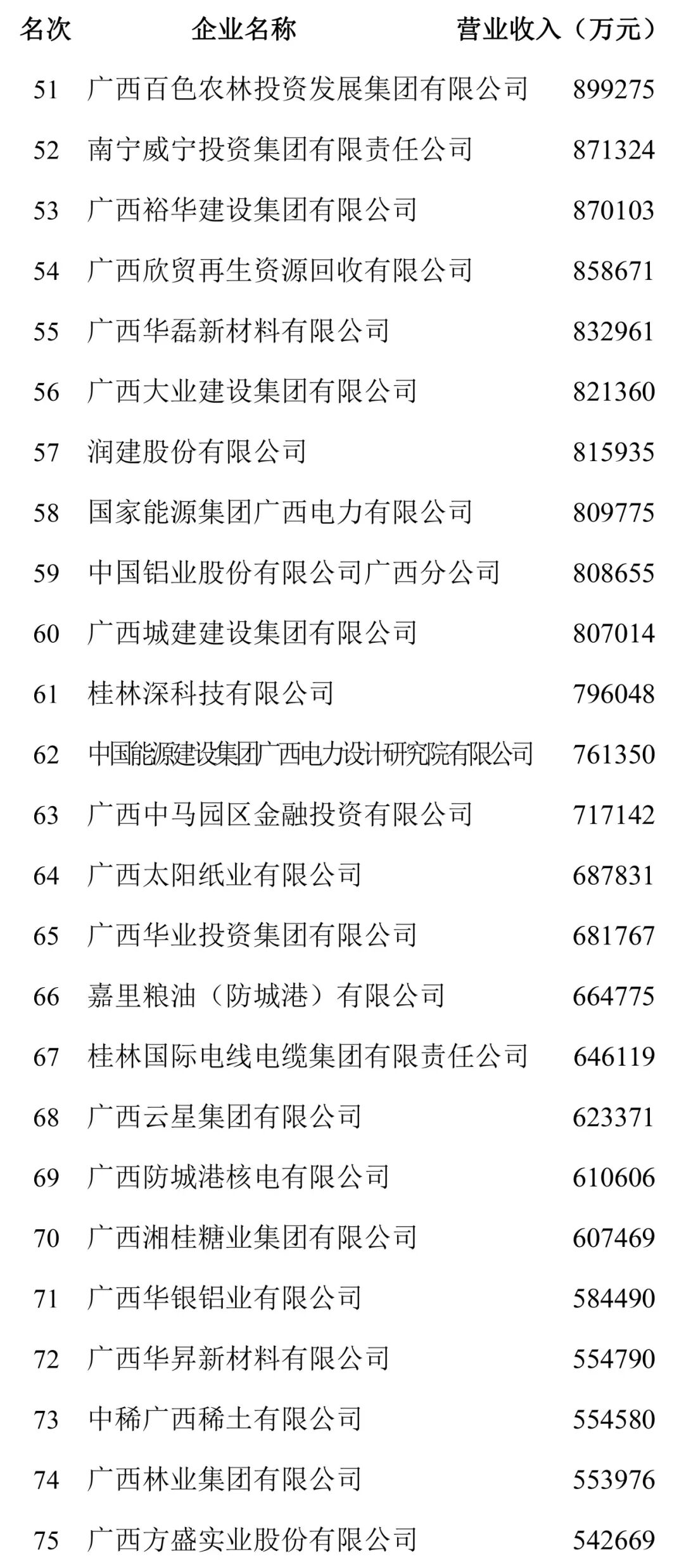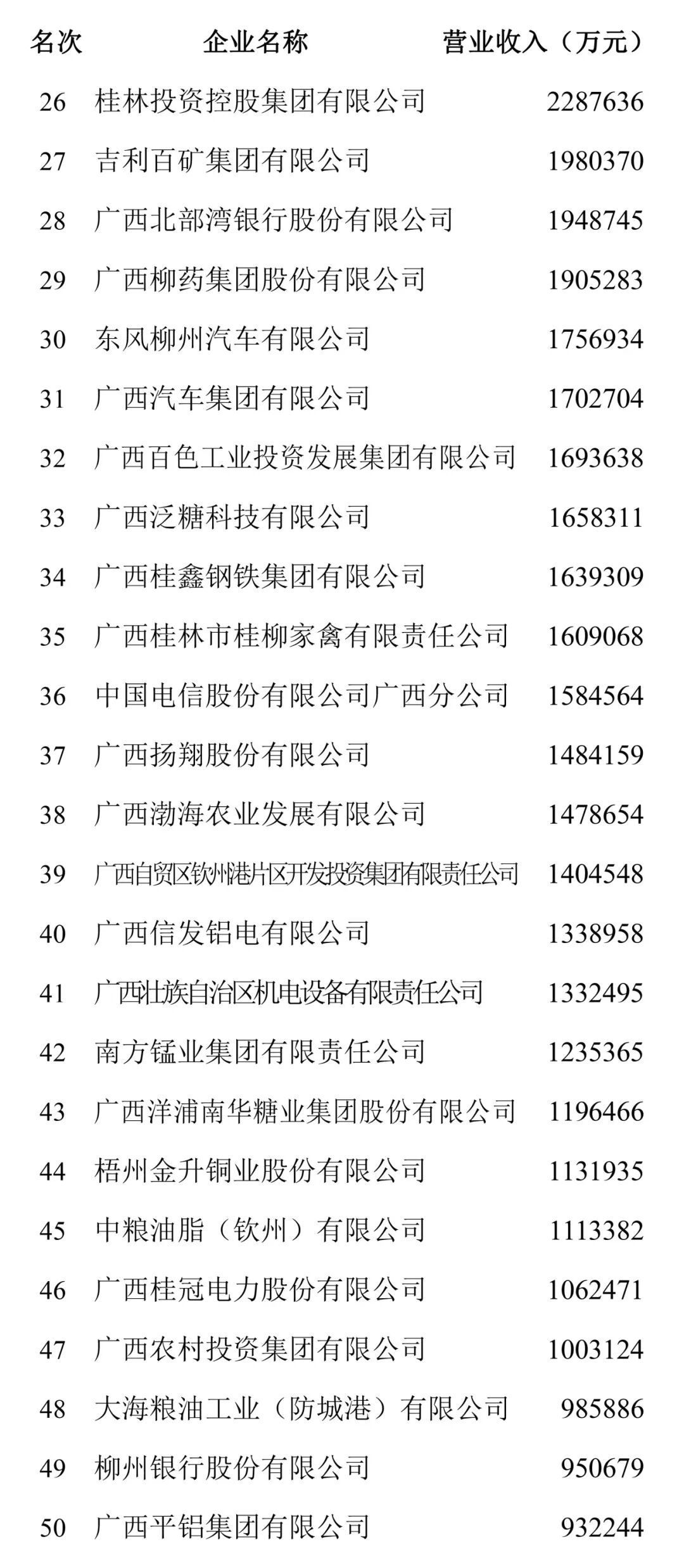 在今年榜单中,广西投资集团有限公司以营业收入2103.00亿元位居榜首,连续七年领跑全区;广西北部湾国际港务集团有限公司、广西电网有限责任公司分别以营业收入1080.85亿元、1050.74亿元占据榜单第二、三位。