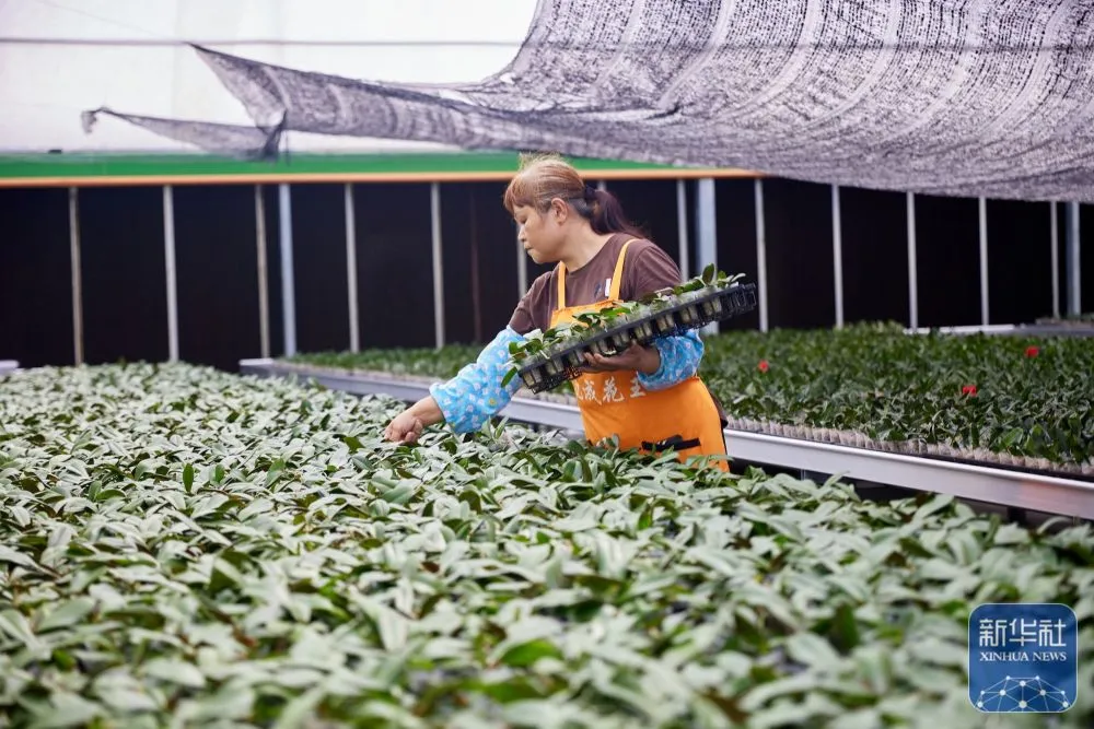 ↑工人在智能温控大棚内护理花卉