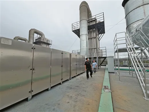 在产业园里,工作人员正在厂房楼顶检查废气排放设备。广西云-广西日报记者周伟武/摄