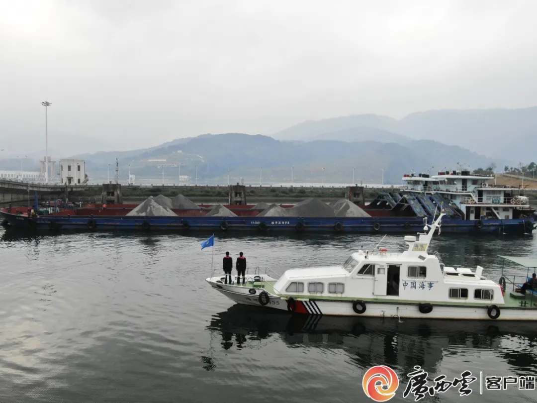 海事、交通运输综合行政执法局、航道等部门对大藤峡船闸岁修施工船舶开展现场安全监管。林宇航 摄