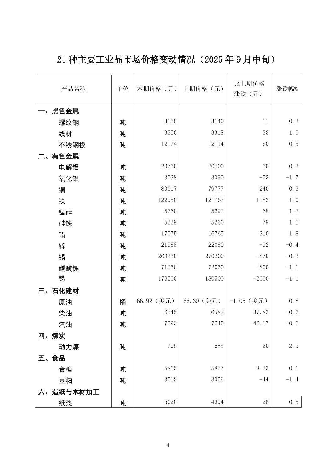 2025年9月中旬21种主要工业品市场现货价格变动情况