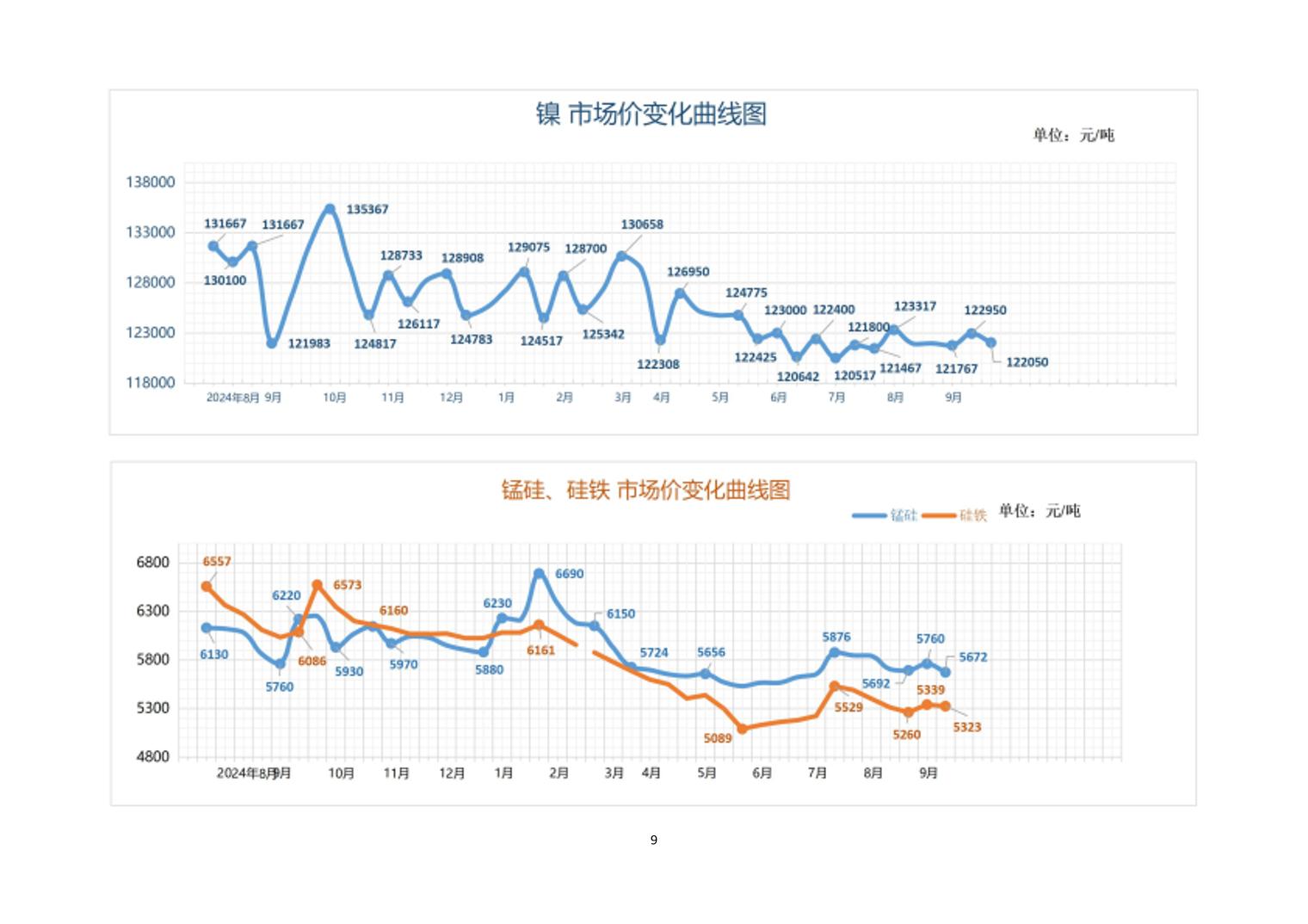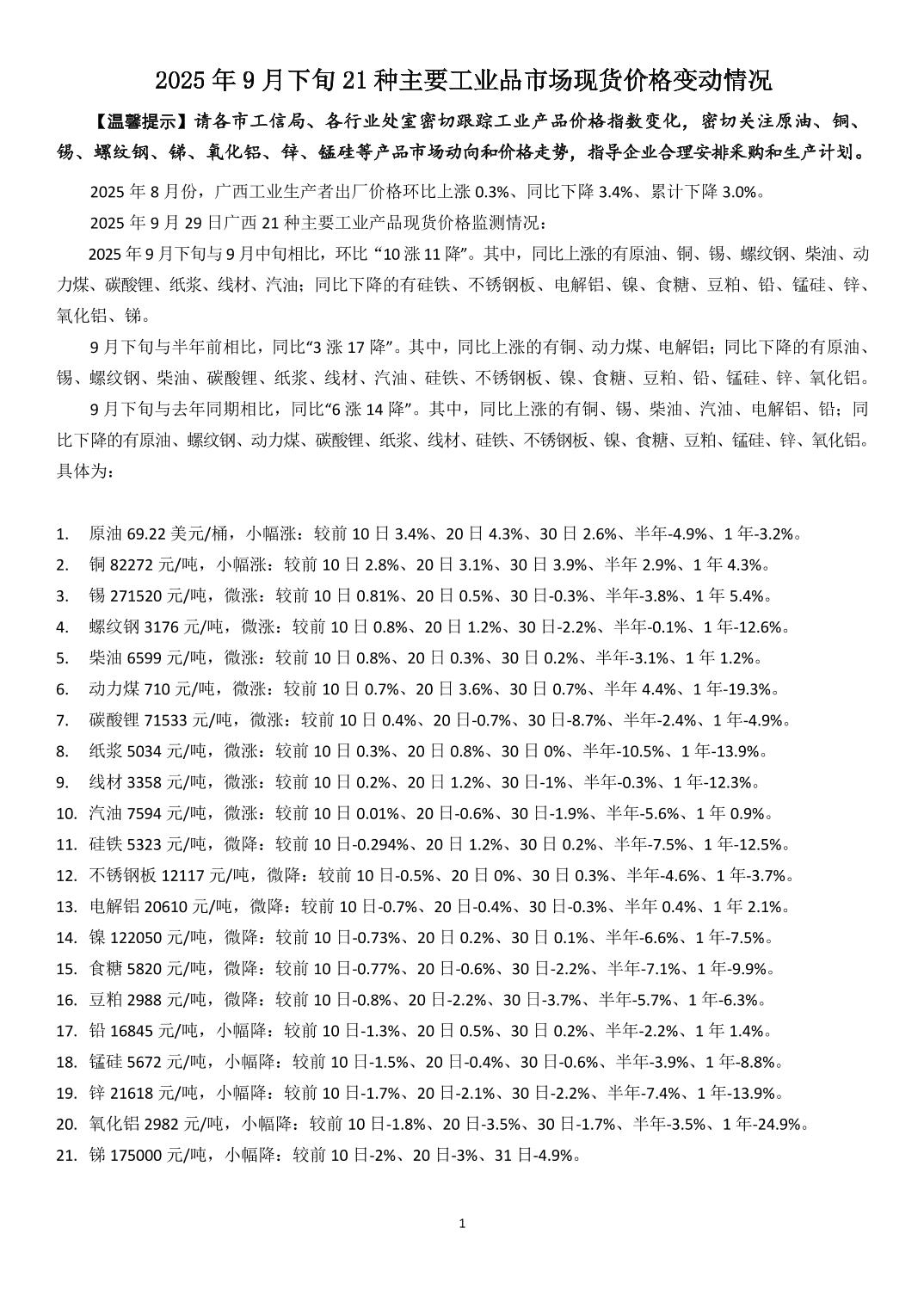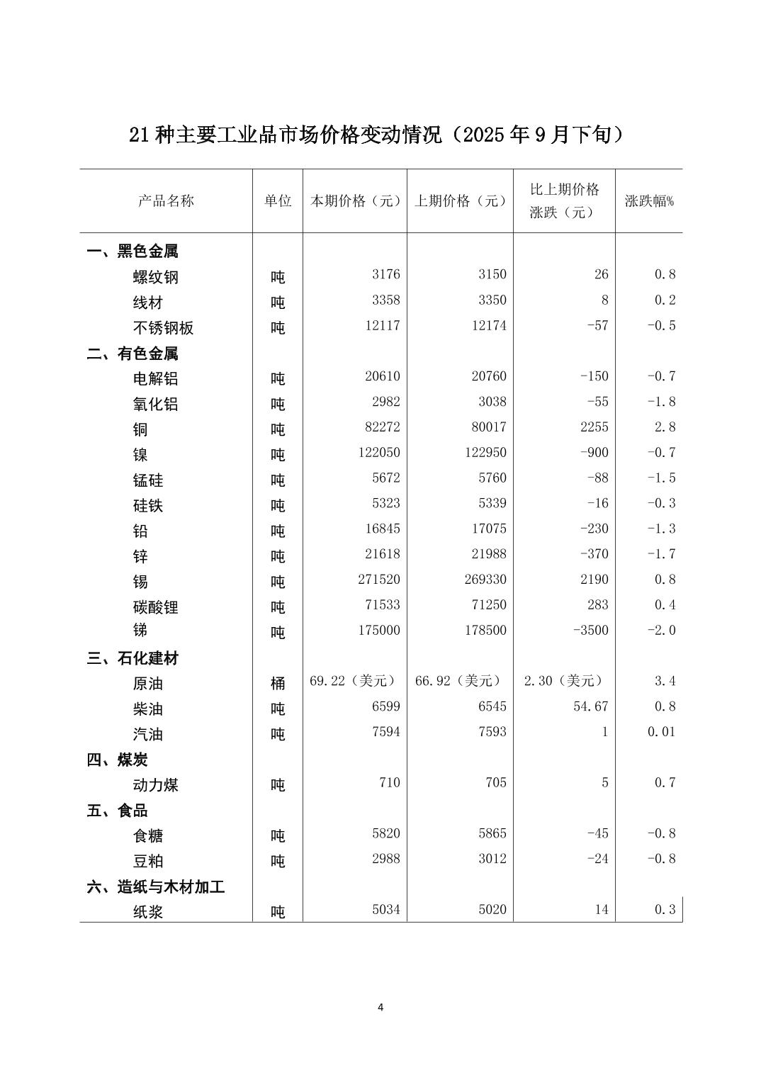 2025年9月下旬21种主要工业品市场现货价格变动情况