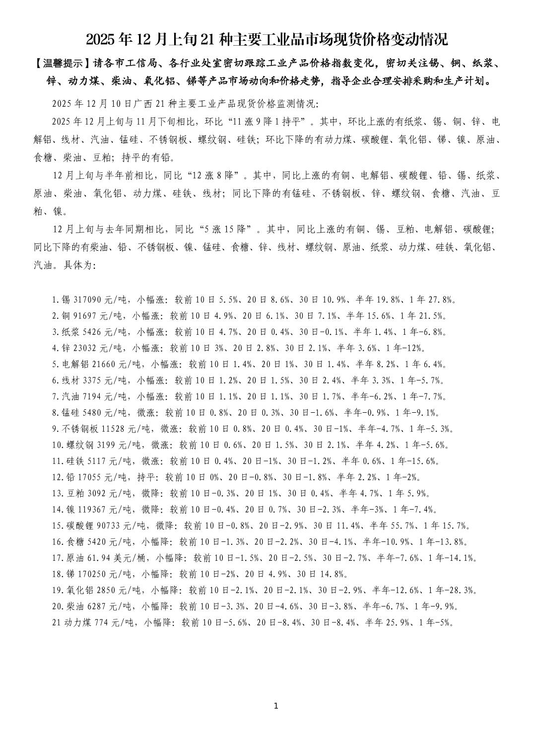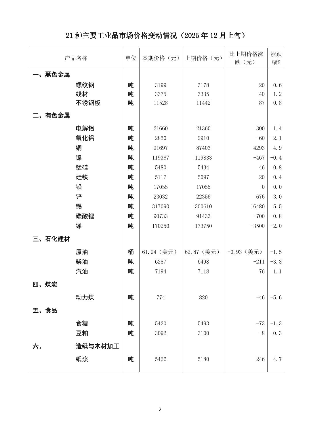 2025年12月上旬21种主要工业品市场现货价格变动情况