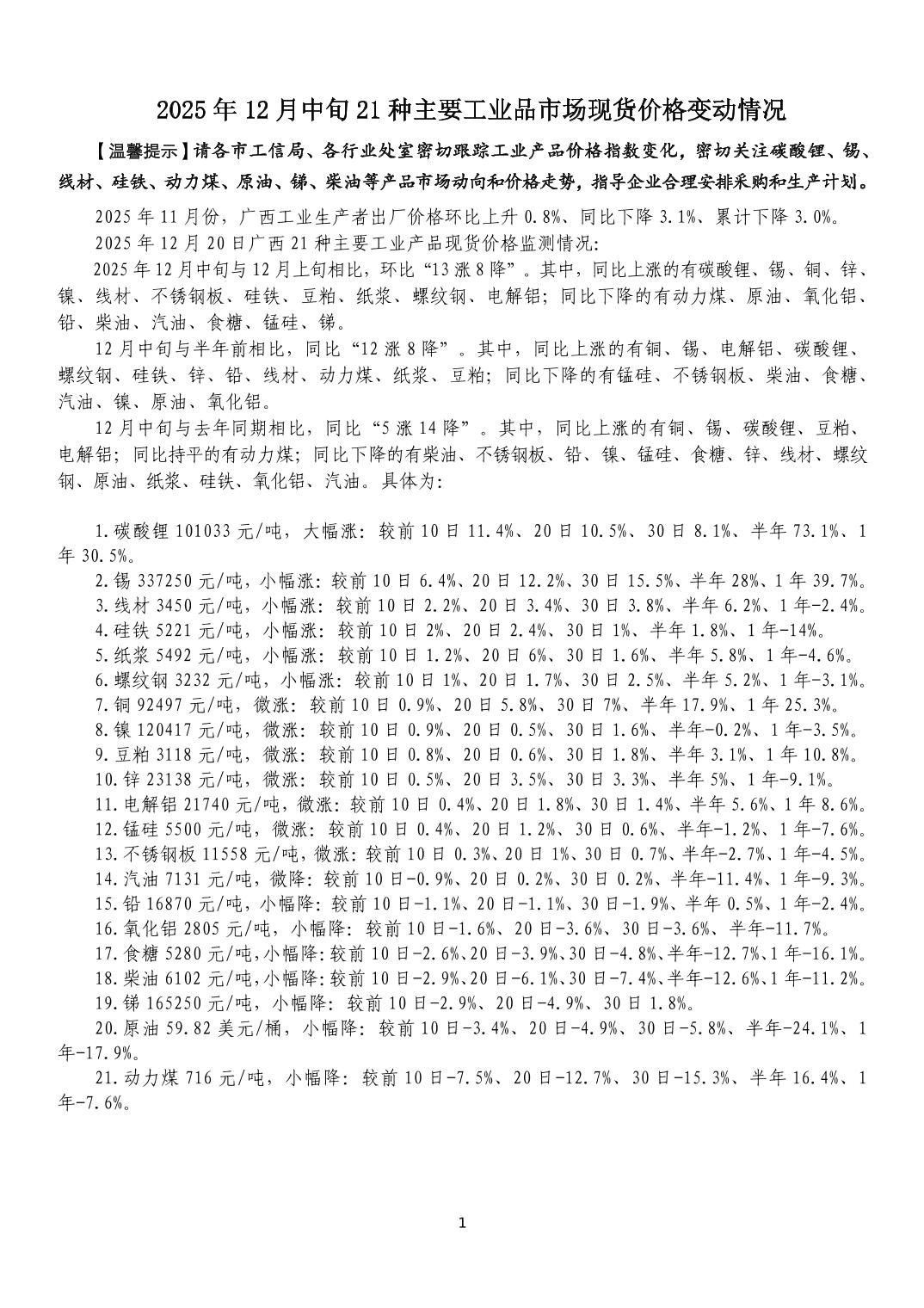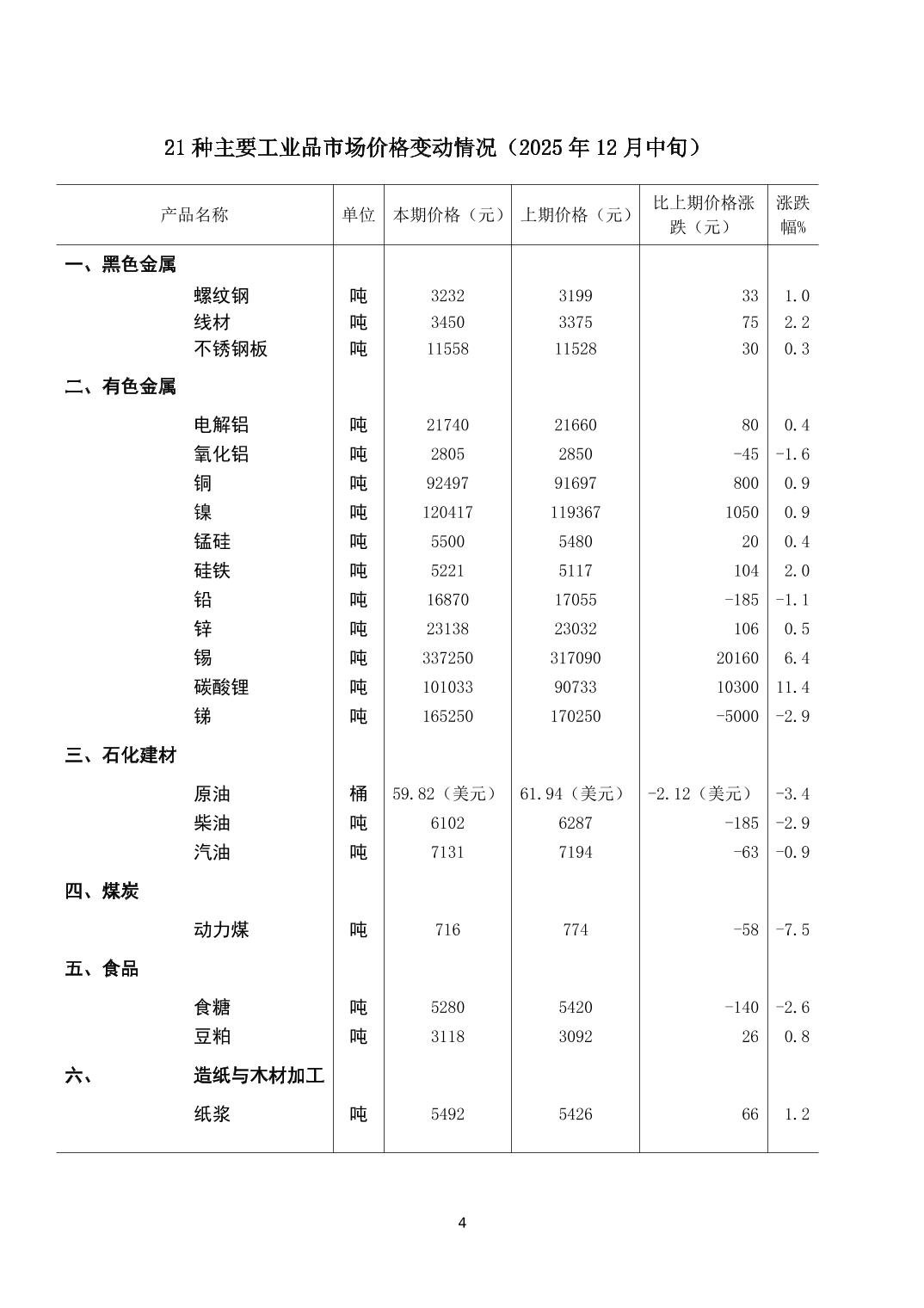 2025年12月中旬21种主要工业品市场现货价格变动情况