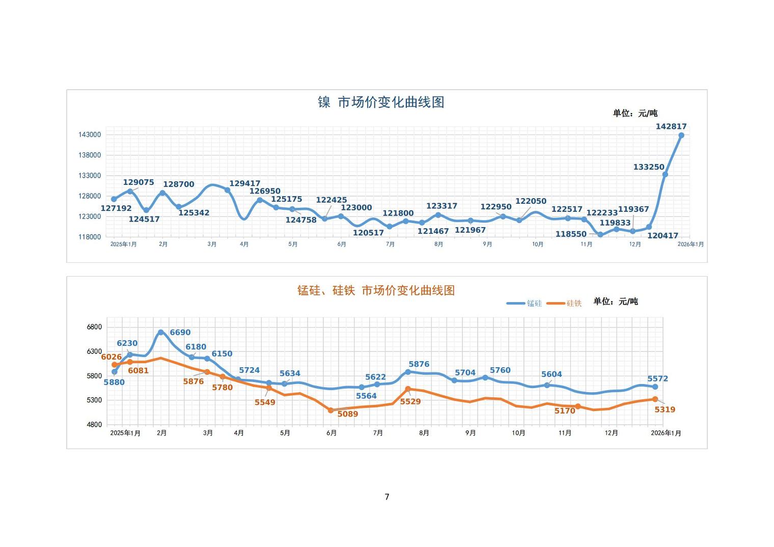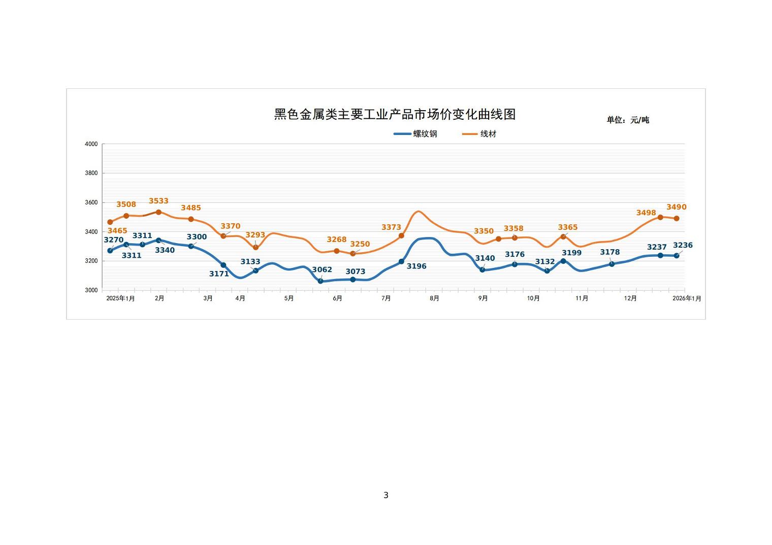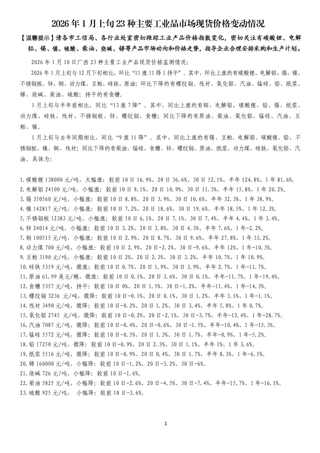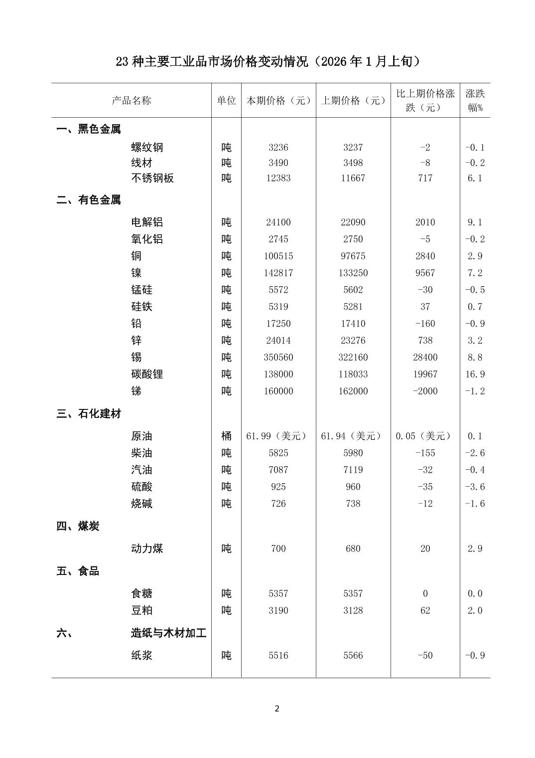 2026年1月上旬23种主要工业品市场现货价格变动情况