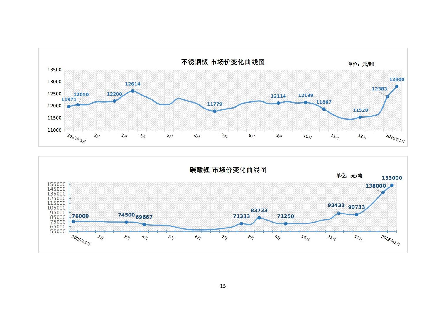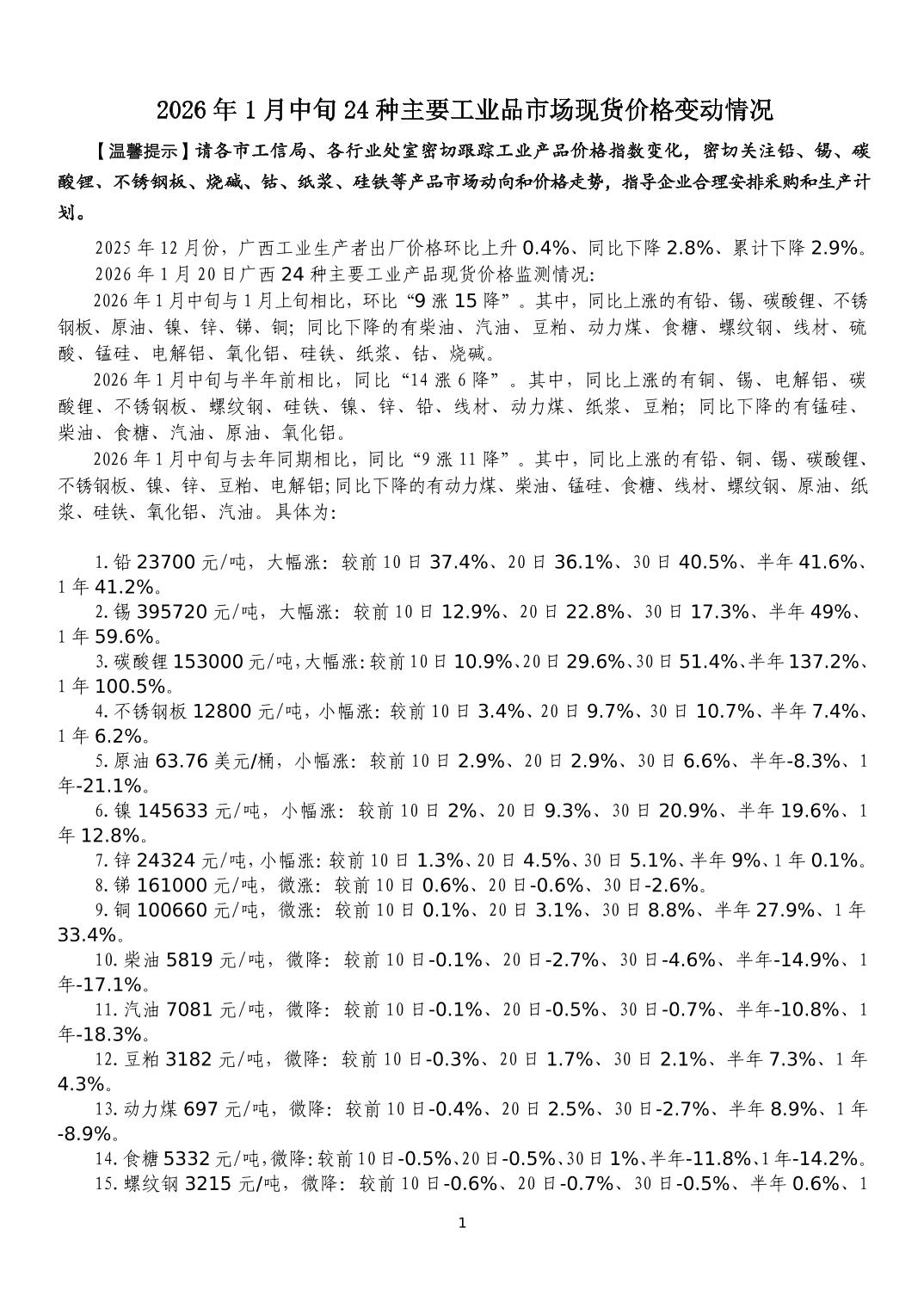 2026年1月中旬24种主要工业品市场现货价格变动情况