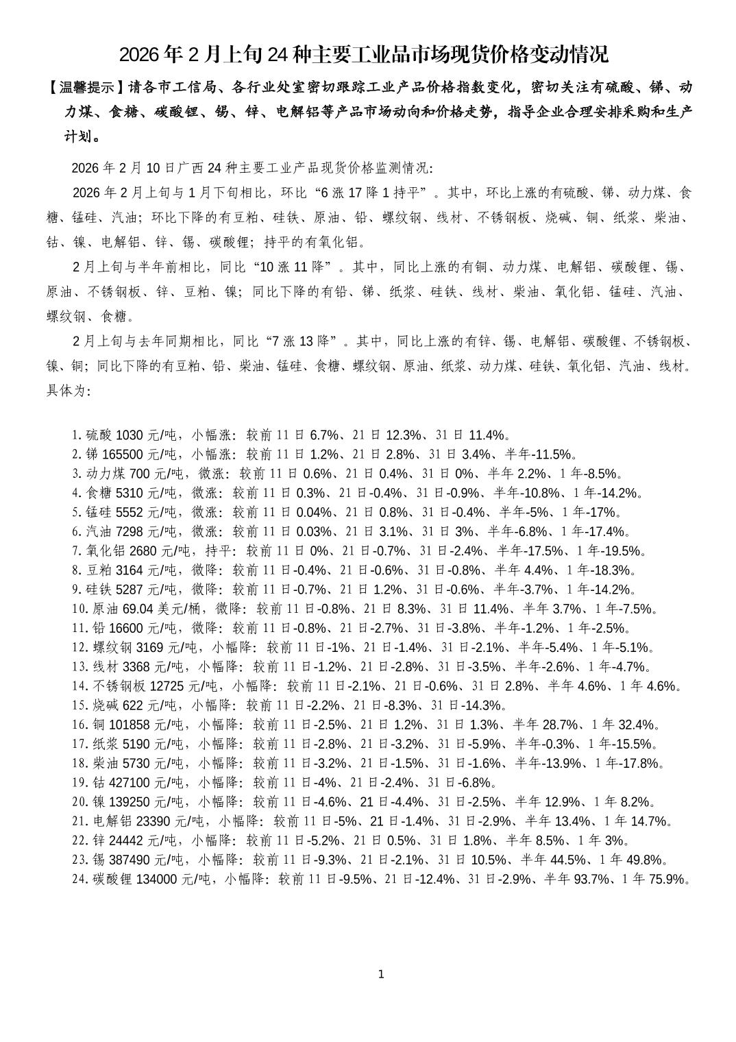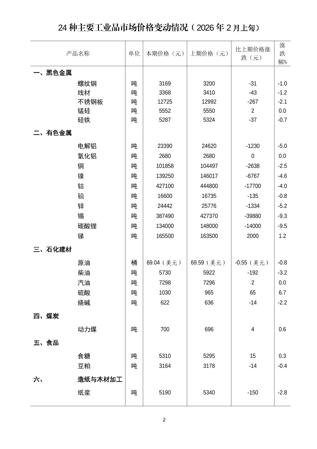 2026年2月上旬24种主要工业品市场现货价格变动情况