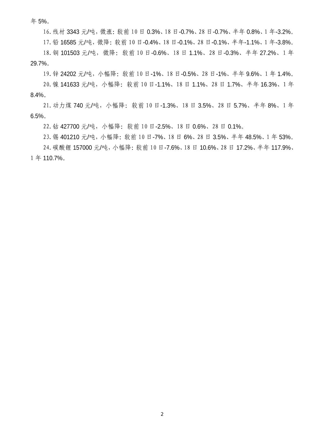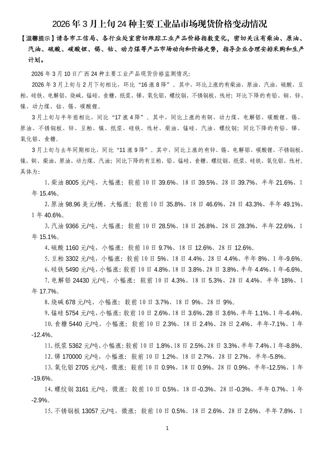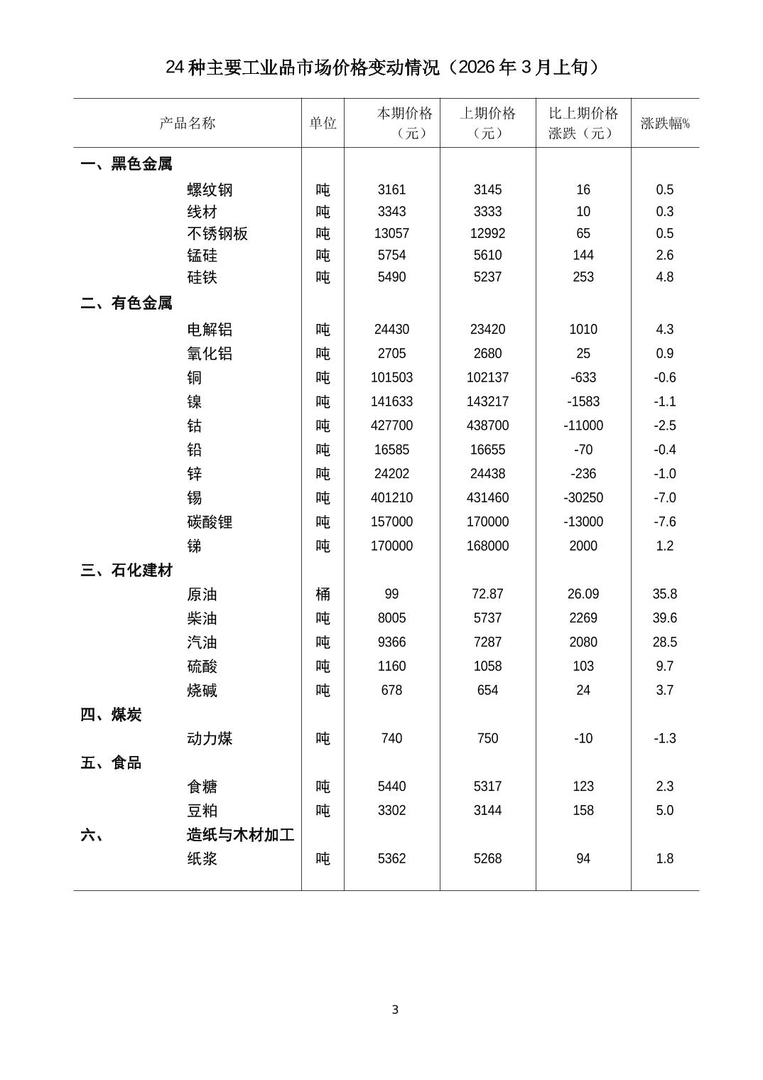 2026年3月上旬24种主要工业品市场现货价格变动情况