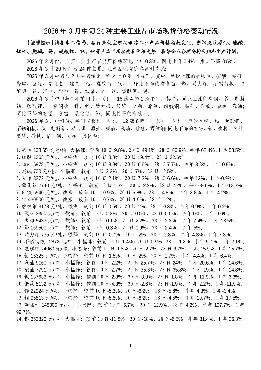 2026年3月中旬24种主要工业品市场现货价格变动情况