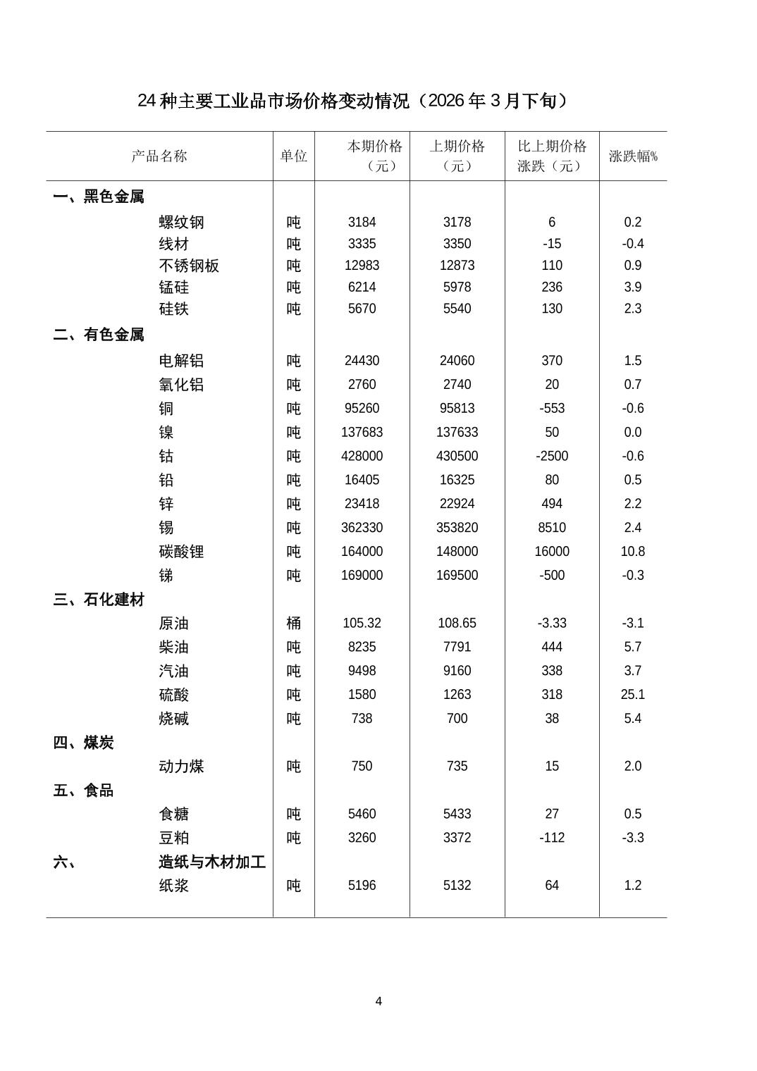 2026年3月下旬24种主要工业品市场现货价格变动情况