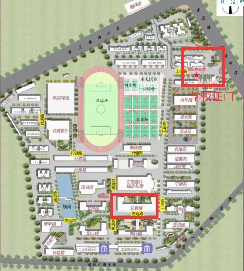 弘毅楼。考生当天统一由学校正门进出校园(南宁市秀灵路37号),校园地图参考附件5。